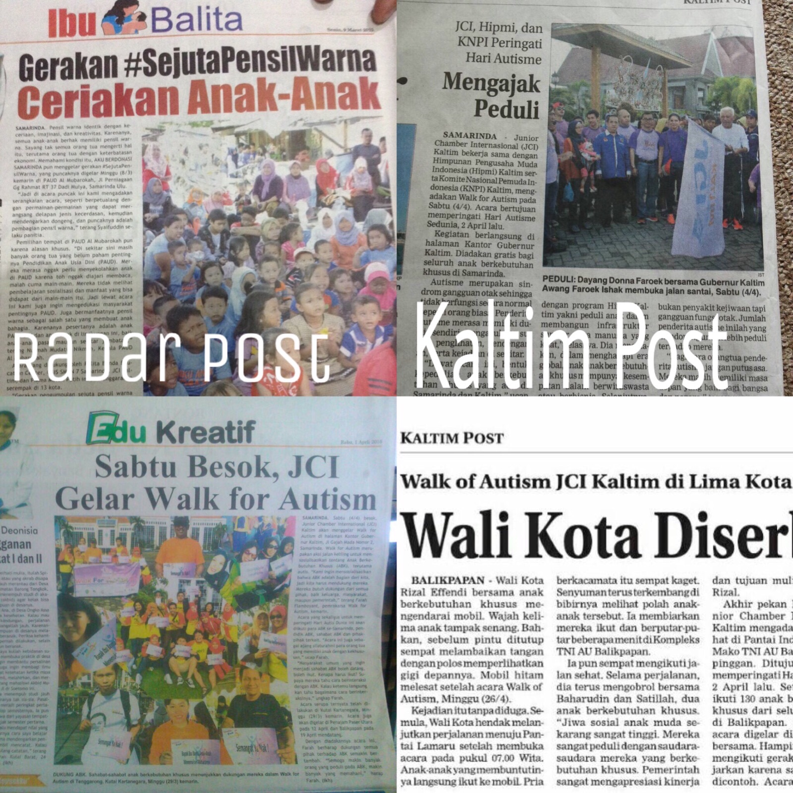 Dalam Rangka memperingati HARI AUTIS SEDUNIA kami dari Organisasi Junior Chamber Internasional (JCI) Kaltim mengambil inisiatif untuk menyelenggarakan kegiatan Jalan santai yang akan diadakan bersama-sama dengan seluruh pemerhati dan masyarakat yang peduli dengan anak-anak berkebutuhan khusus yang akan diselenggarakan serentak bersama dengan seluruh Chapter JCI se Indonesia...