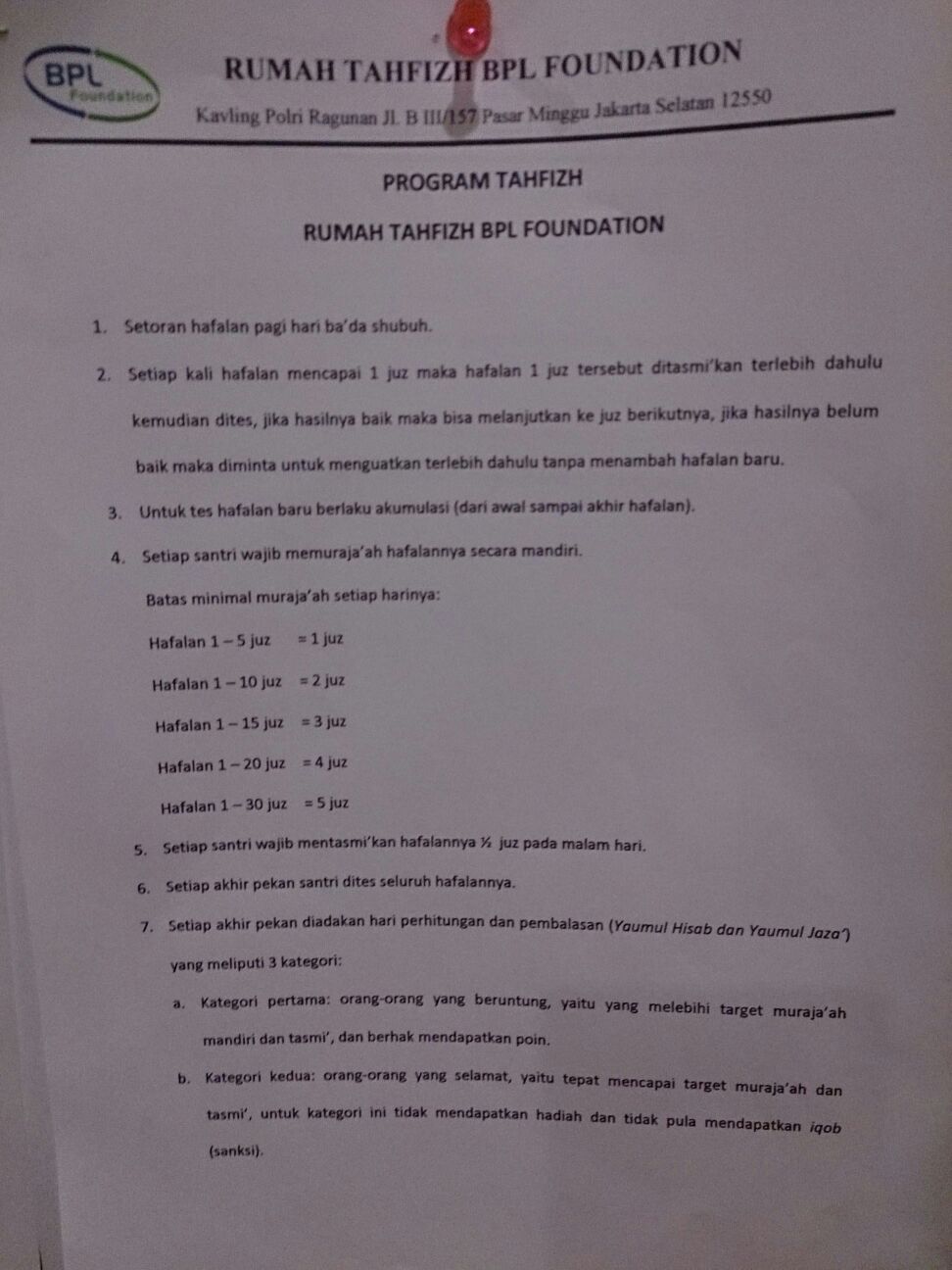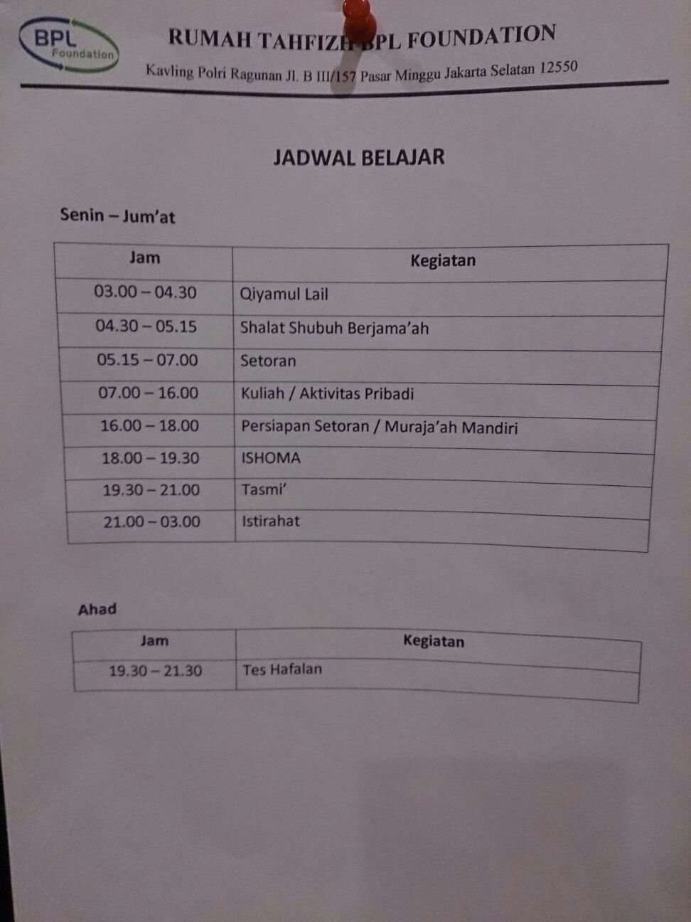 Jadwal belajar tersebut wajib dipatuhi oleh seluruh santri. Jika ada keperluan/ halangan untuk hadir, wajib melapor kepada Ust pembimbing.